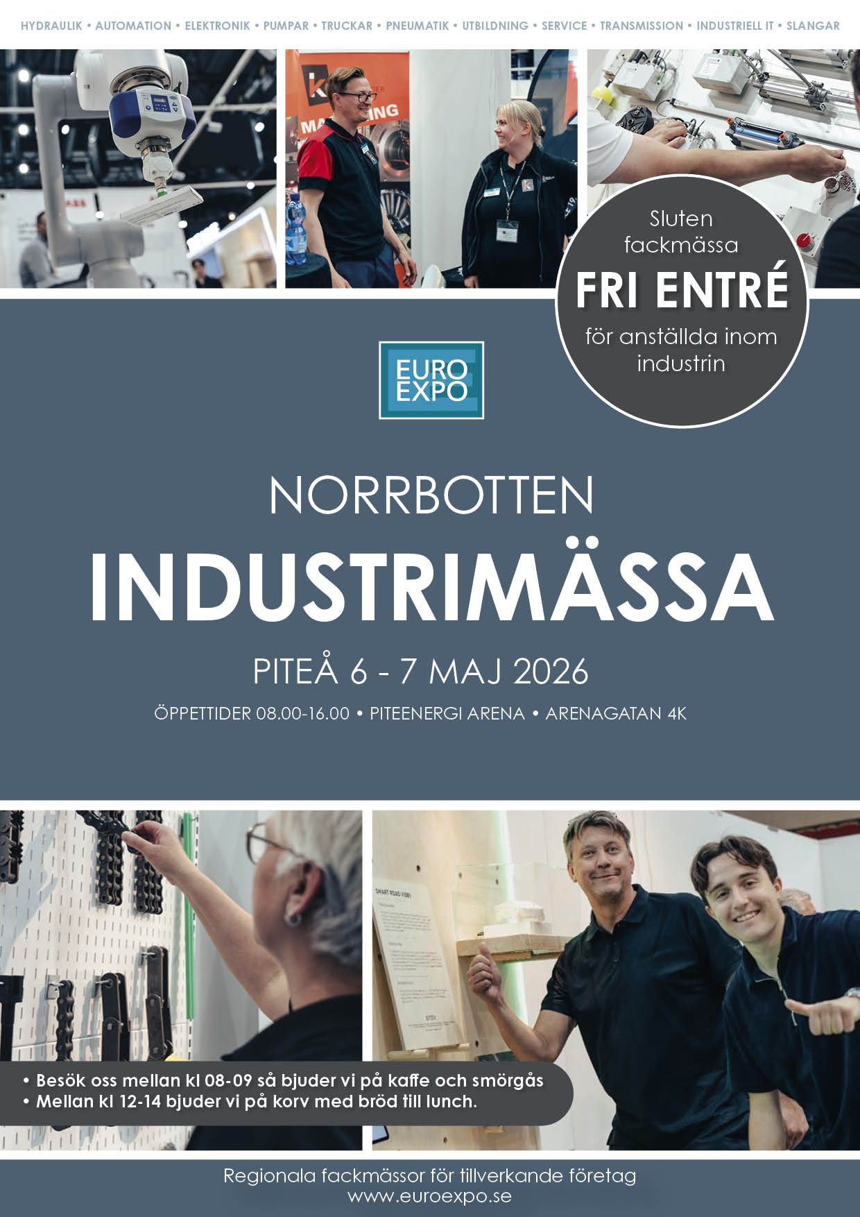 ● Möt delar av landets marknadsledande leverantörer som presenterar produkter och tjänster för industrin ● Fri entré för anställda inom industrin ● Gratis kaffe och smörgås mellan kl. 08-09 ● Vi bjuder på korv med bröd till lunch mellan 12-14